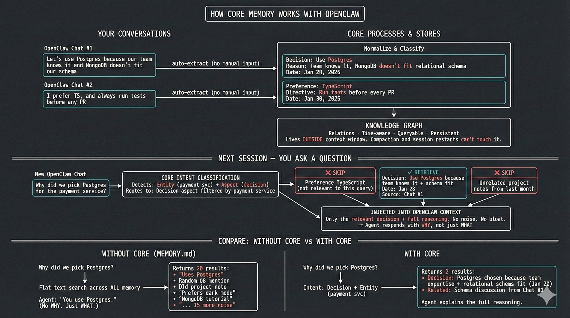 Every conversation goes through a normalization pipeline - each message is linked against your existing context, enriched with timestamps, and stored as a complete episode capturing what happened, when, and why. From that episode, CORE extracts structured facts and classifies each one by Aspect type - was this a preference, a decision, a directive, a relationship? So when you tell your agent "let's go with PostgreSQL because our team already knows it and MongoDB's document model doesn't fit our relational data," CORE doesn't just store "uses PostgreSQL." It captures the full reasoning as a Decision, links it to the project context, and preserves the tradeoffs you considered. Months later, when you or your agent asks why — the answer is still there.
