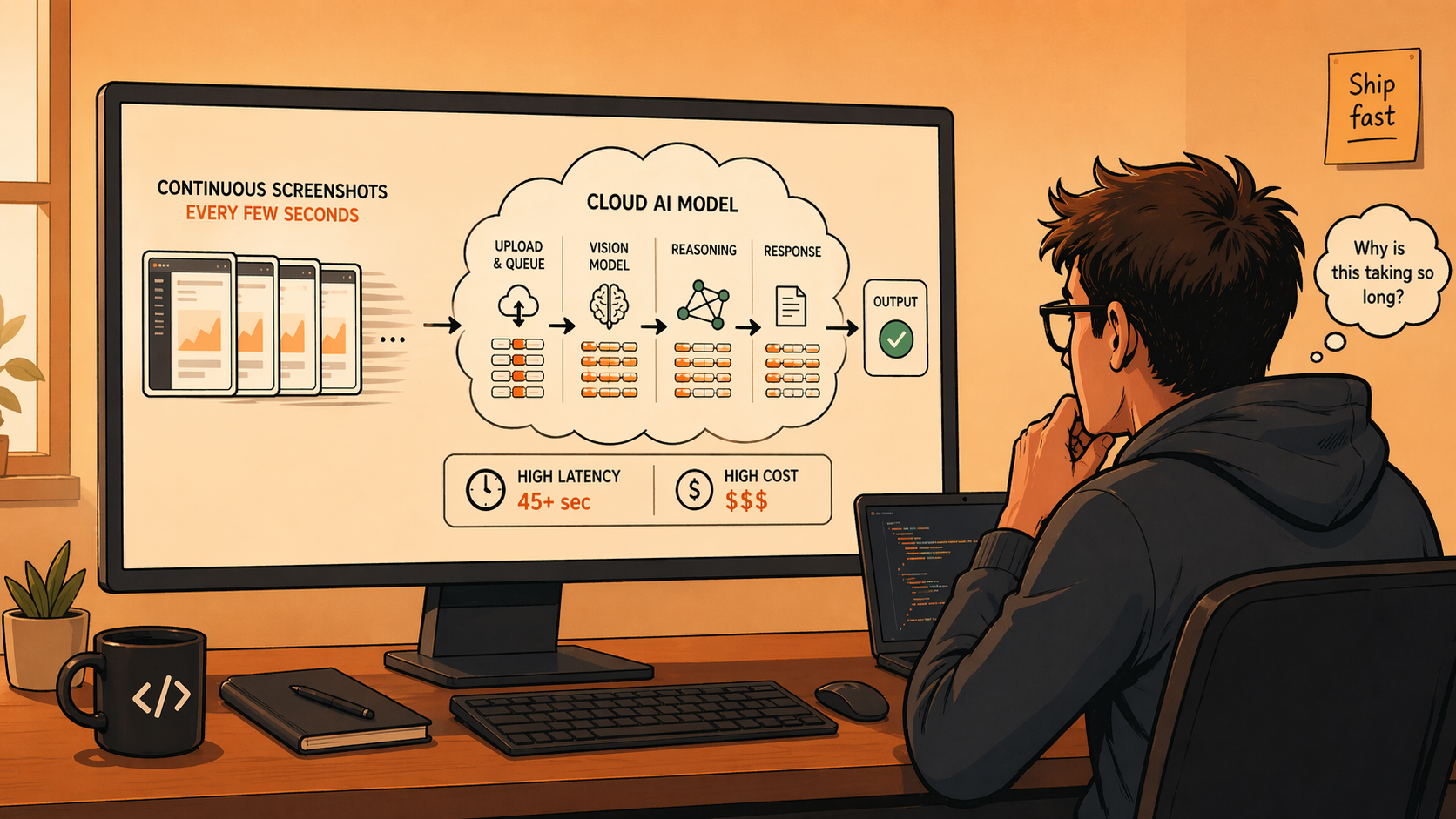 The approach I started with: screenshot every few seconds, send the image to a vision model, ask "what's happening here?" It worked. Then I looked at my bill.