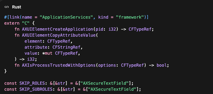 AXSecureTextField has to be excluded - anything under it is sensitive and should never be captured. If you don't filter aggressively, you're reading data that has no business leaving the device.