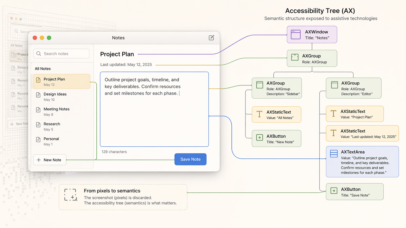 On macOS, apps expose their UI through the accessibility system as a structured tree. Every window, button, text field, and list item has a role and a value - the same data the OS uses for VoiceOver.