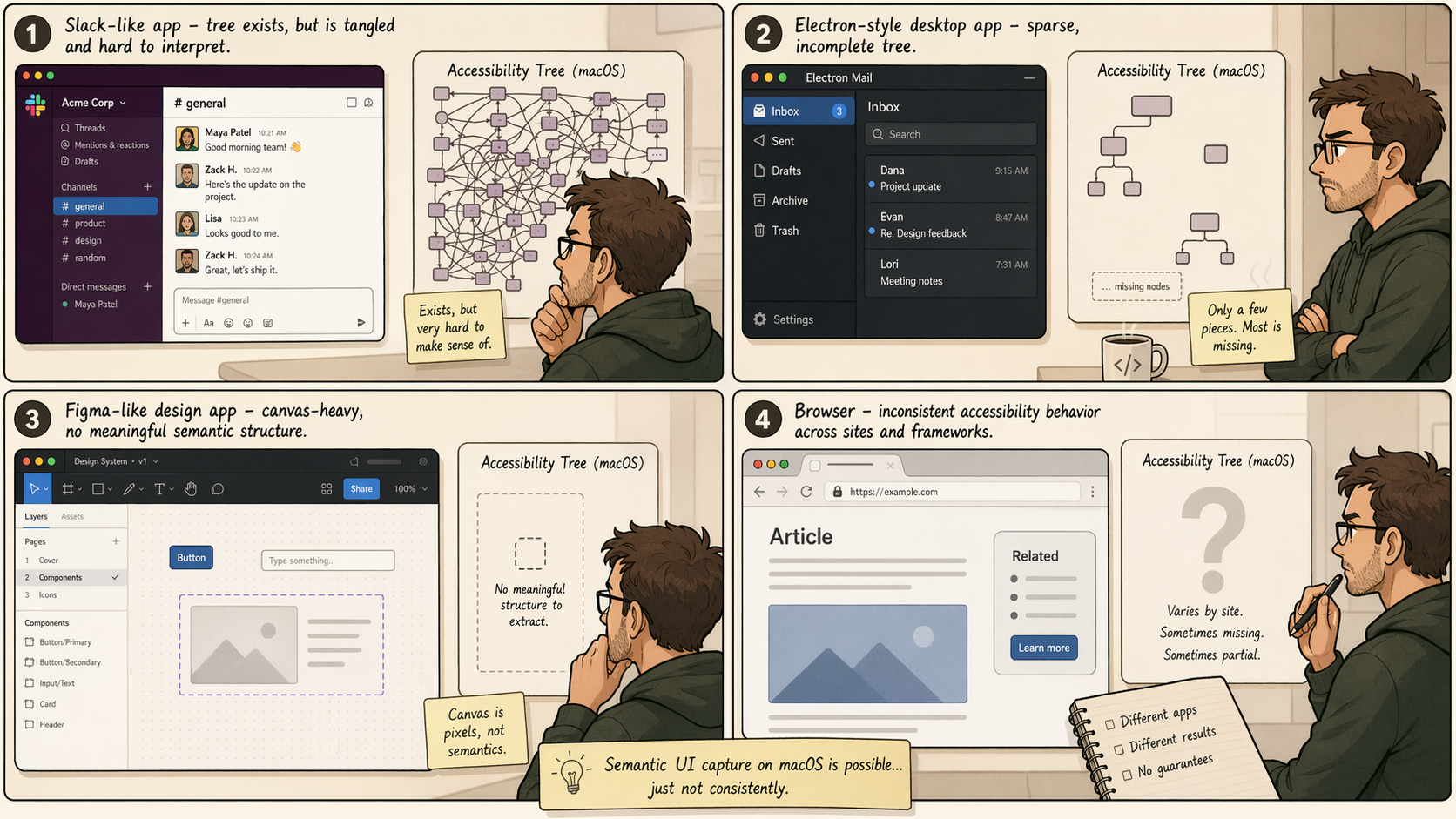 Canvas-heavy apps like Figma are worse - the UI is pixels by design. There's no semantic structure to walk. You fall back to vision, full stop.