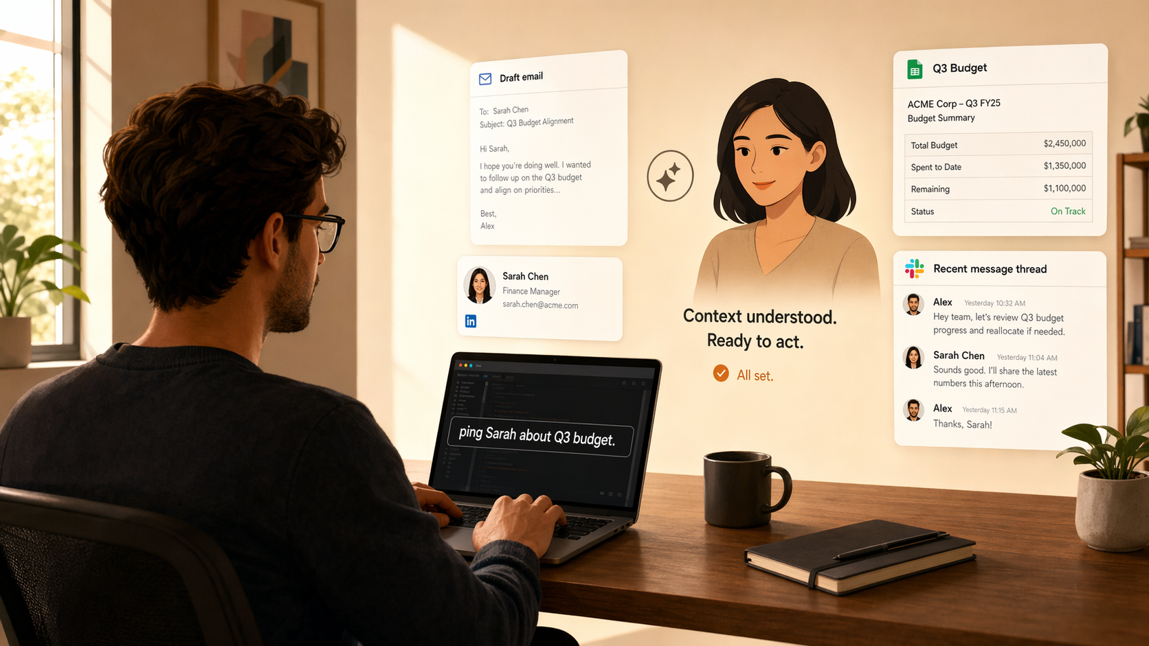 The difference shows up in simple moments. If you write "ping Sarah about Q3 budget," the agent has a much better shot at turning that into the actual email without first asking who Sarah is or what Q3 budget refers to. The model didn't get smarter. The agent just showed up with context.