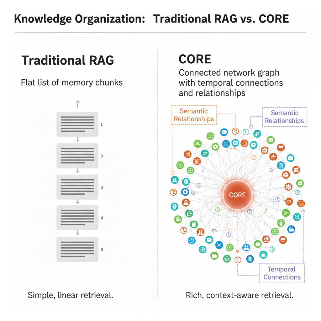 CORE uses a temporal knowledge graph instead of simple vector search, every conversation becomes part of a living, connected memory that tracks when information was added, understands how concepts relate to each other, preserves the evolution of your thinking over time, and works across every AI tool you use.