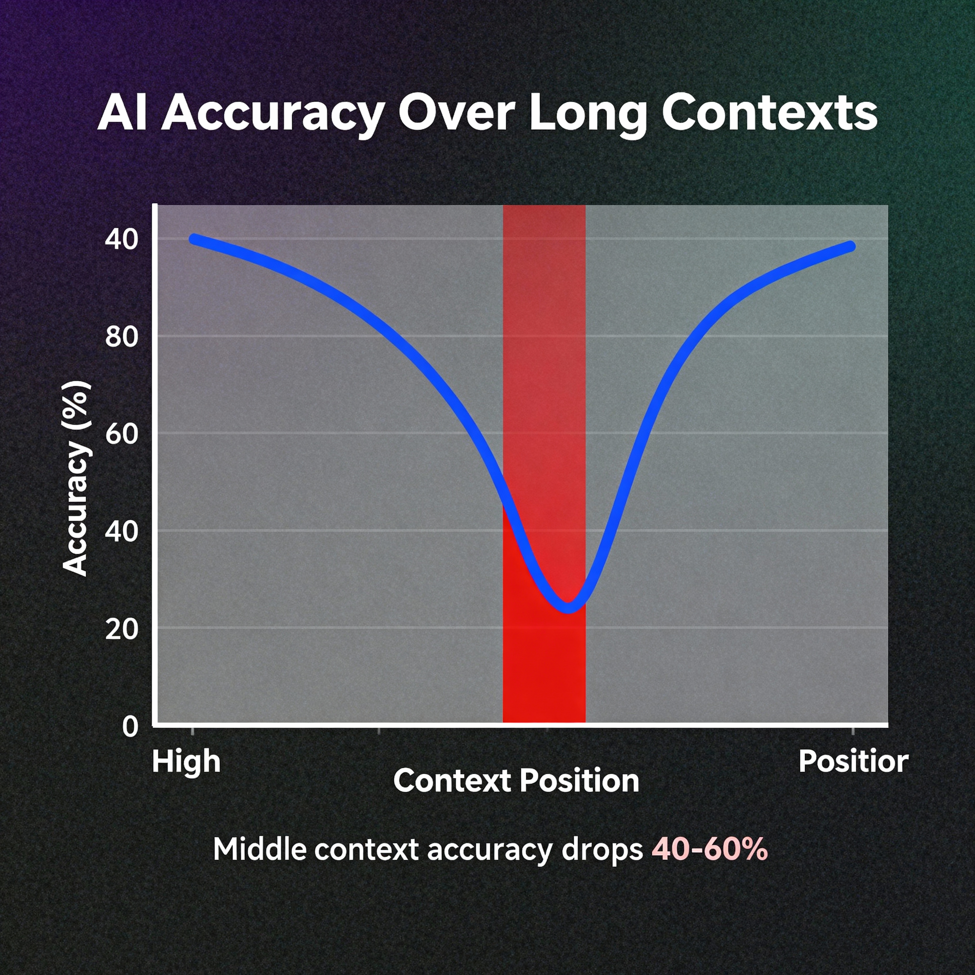 - Lost in the middle: Research shows AI accuracy drops 40-60% for information buried in the middle of long contexts, the models remember the start and end but can't find that one specific fact from paragraph 247